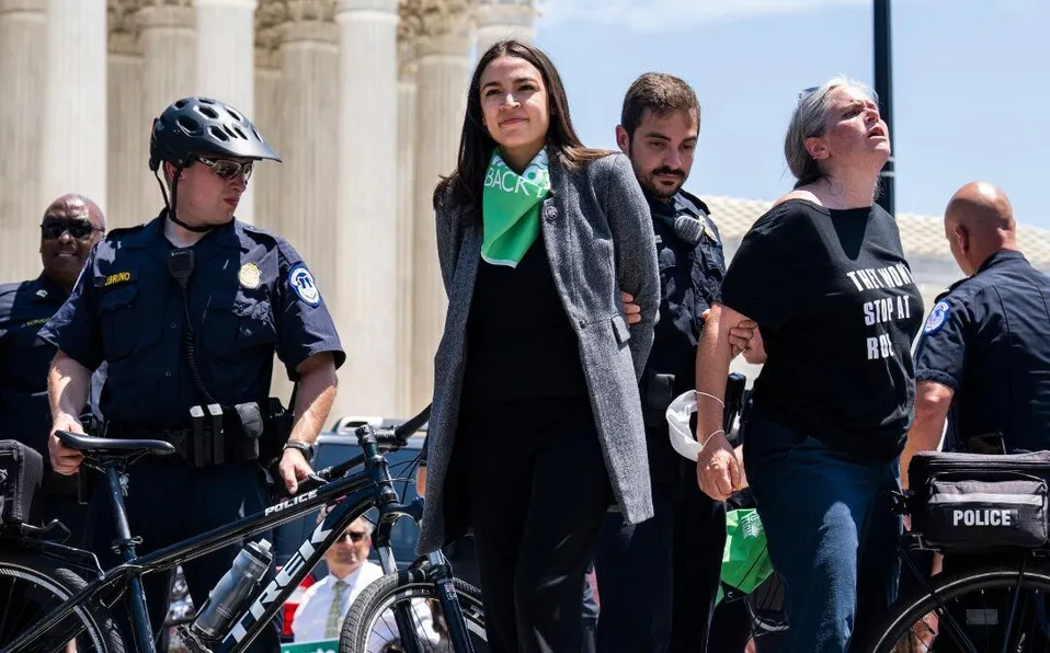 La legisladora de la ala progresista demócrata fue arrestada por agentes de la Policía del Capitolio en Washington D.C. por bloquear el tráfico frente al Supremo. Ocasio-Cortez fue escoltada fuera de la zona por los policías mientras llevaba las manos a la espalda, ante lo que muchos creyeron que había sido esposada, aunque finalmente no lo estaba.
