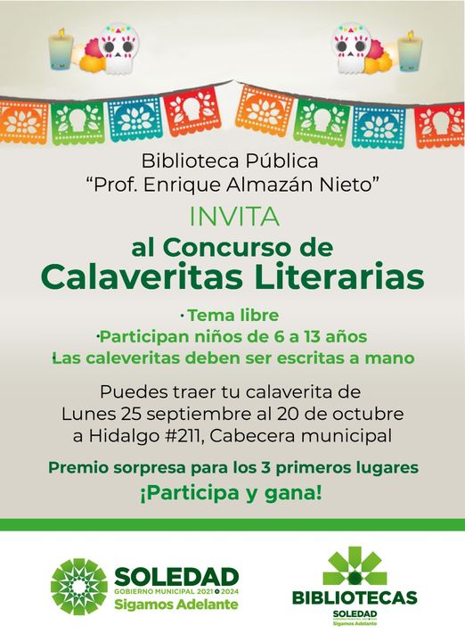 La Coordinación Municipal de Bibliotecas de Soledad de Graciano Sánchez, en favor de un desarrollo integral y el fortalecimiento de la creatividad infantil, invita a niños y niñas de entre 6 y 13 años de edad a participar en el Concurso de Calaveritas Literarias, una iniciativa organizada por la Biblioteca “Rafael Nieto Almazán” en el marco de las festividades de Día de Muertos, informó Guadalupe Cortes, titular del área.