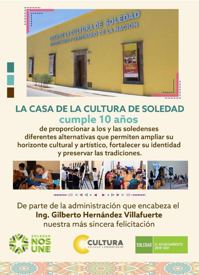 La Casa de Cultura Bicentenario y Centenario de Soledad de Graciano Sánchez, cumple 10 años de haber sido inaugurada, el recinto de todos los soledenses que ofrece actividades formativas y culturales de todo tipo, prepara un programa artístico y de información para celebrar su primera década.