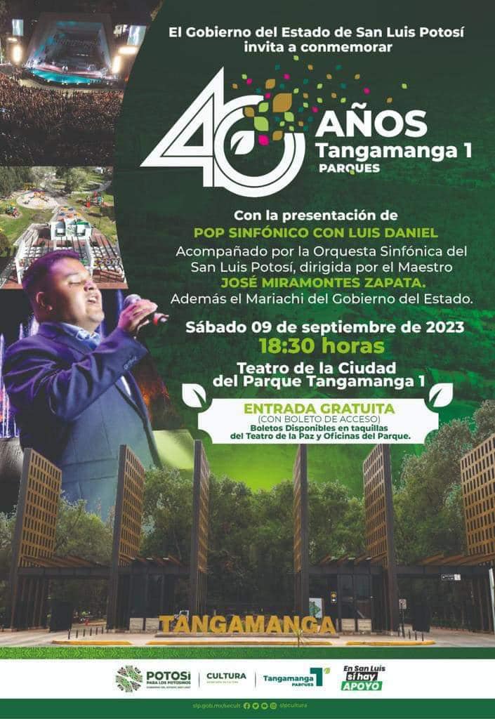 El Gobierno del Estado invita a las y los potosinos a disfrutar del programa artístico y deportivo que se tiene organizado para conmemorar el 40 aniversario del parque Tangamanga I, el bosque urbano más grande de México, que incluye el concierto de la Orquesta Sinfónica de San Luis Potosí, bajo la dirección del maestro José Miramontes Zapata con la extraordinaria voz del intérprete Luis Daniel, este sábado 9 de septiembre y la Carrera Atlética el domingo 10.