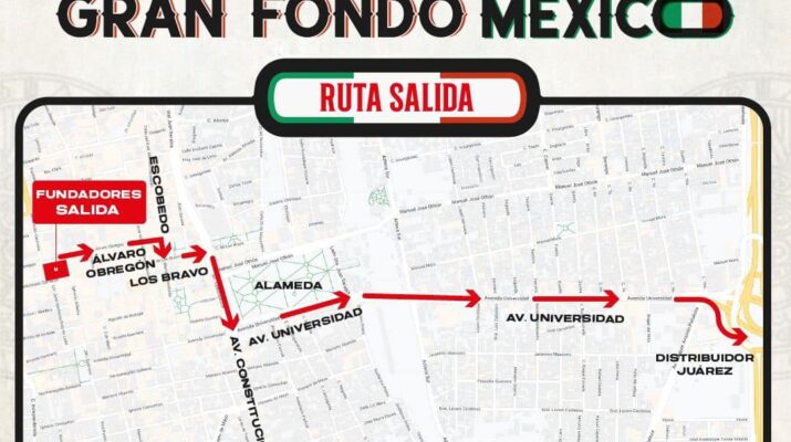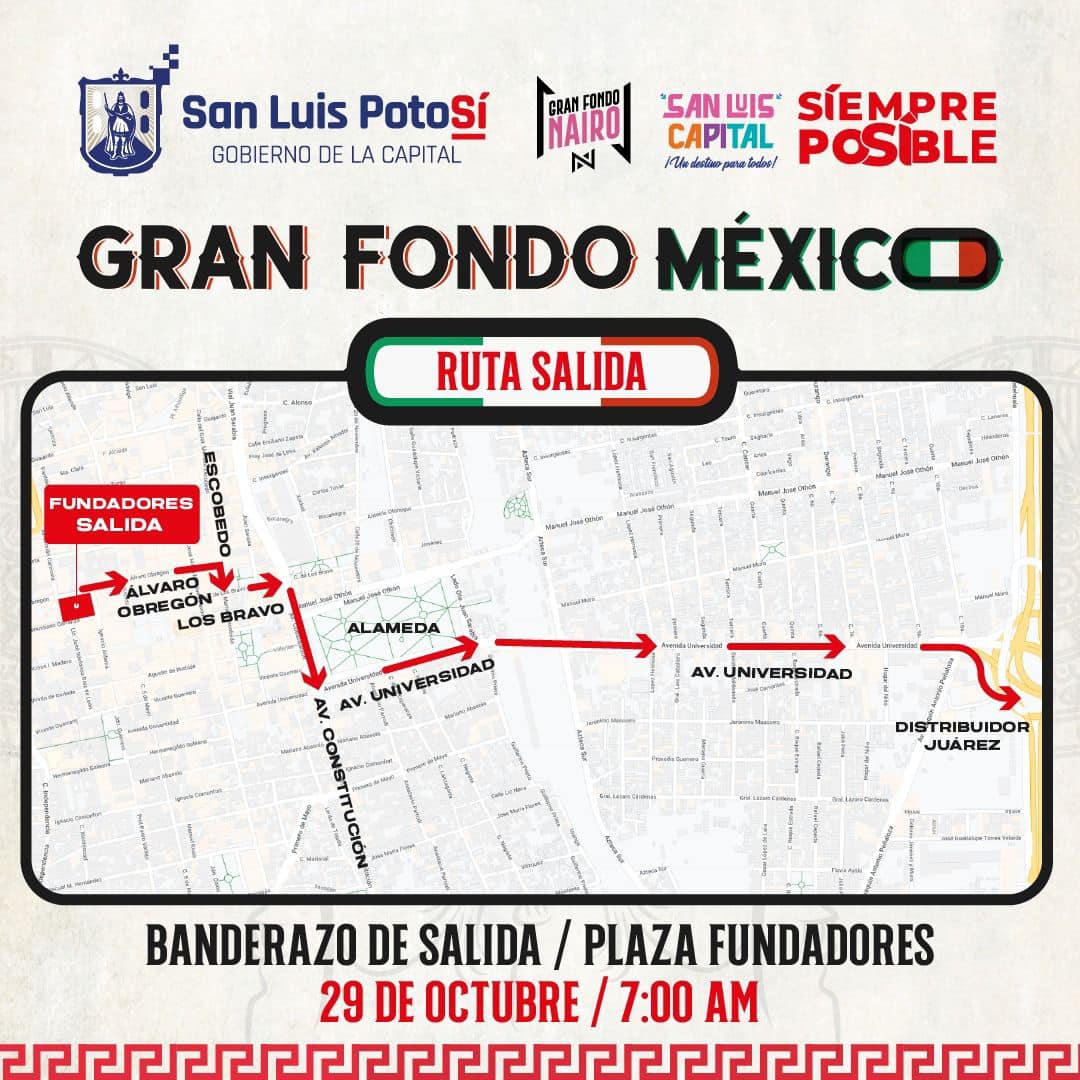 El Gran Fondo Nairo 2023 iniciará en punto de las 7:00 horas de este domingo 29 de octubre en calles del Centro Histórico de la Capital, con salida y meta en Plaza de los Fundadores. Desde este punto, las y los participantes en las rutas de 50 kilómetros, Medio Fondo y Gran Fondo se desplazarán por las calles Álvaro Obregón, Escobedo, Los Bravo, Eje Vial (todas ellas en sentido opuesto a la circulación) y Juan Sarabia en dirección a la Alameda.