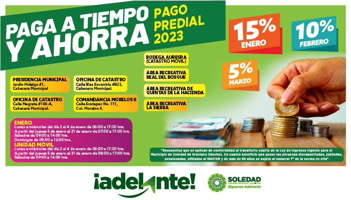 Con el fin de fomentar la cultura de pago del impuesto predial y evitar daños al bolsillo de los contribuyentes, este lunes 2 de enero inicia el programa de descuentos “Predial 2023” en el municipio de Soledad de Graciano Sánchez.