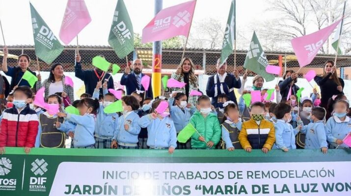 En representación de la alcaldesa de Soledad de Graciano Sánchez, Leonor Noyola Cervantes; el Secretario General del Ayuntamiento, Ernesto Barajas Ábrego acompañado de la Presidenta del Sistema Estatal DIF, Ruth González Silva; el Secretario de Educación de Gobierno del Estado, Juan Carlos Torres Cedillo, así como la Presidenta del Sistema Municipal DIF, María del Pilar Cardona Reyna, entre otros integrantes del gabinete estatal y municipal de Soledad, participaron en el evento de arranque de remodelación del jardín de niños María de la Luz Wong.