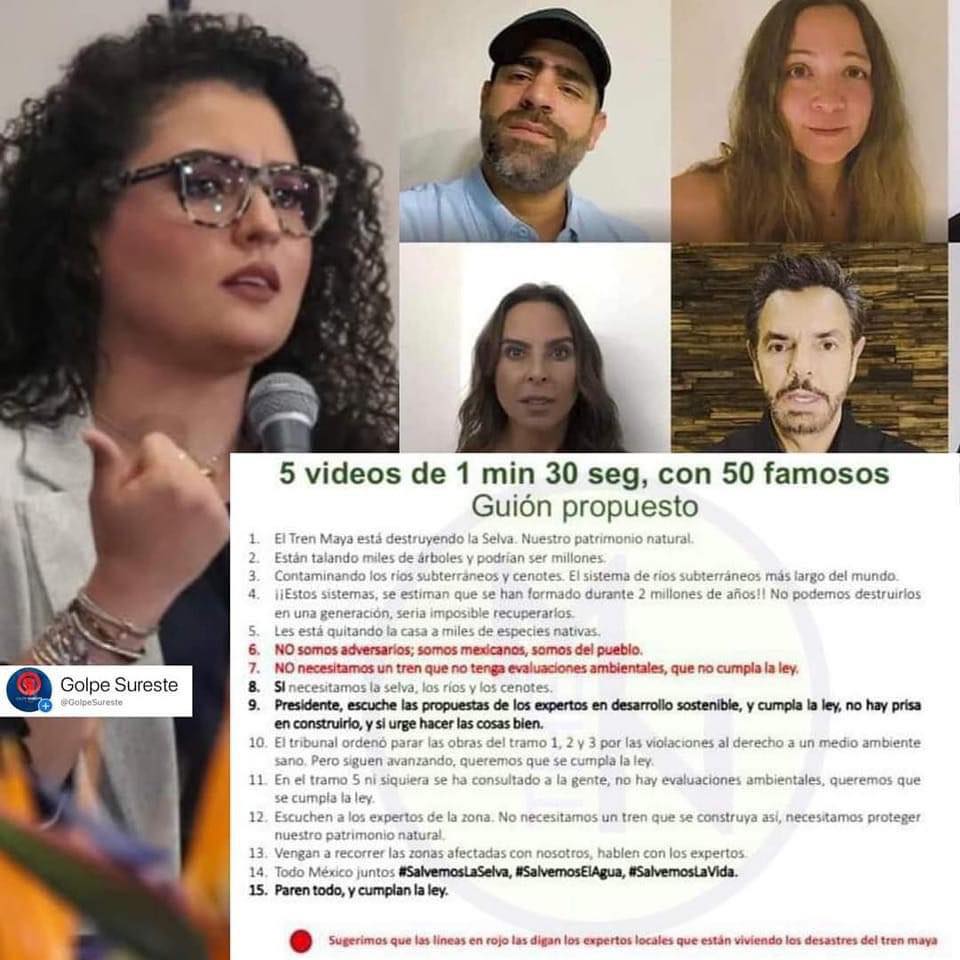 Así es, tal y como lo sospechó el presidente AMLO y miles de mexicanos, ya salió a la luz el guión con el que los famosos hablaron en contra de la construcción del Tren Maya.