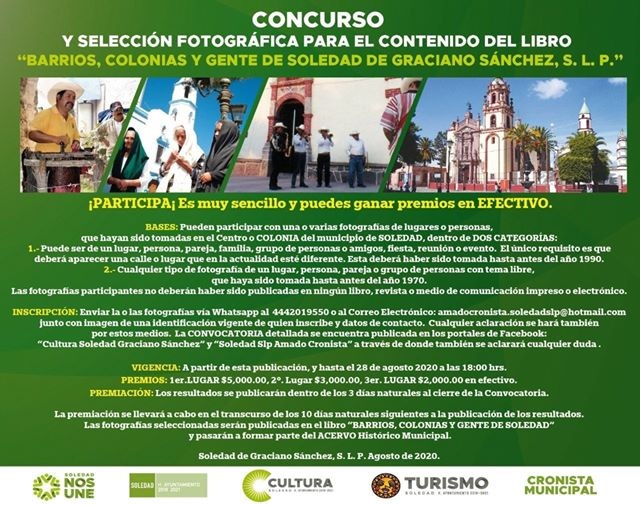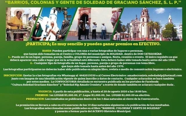 Continuando con el rescate e impulso de la identidad del pueblo soledense, se emitió la convocatoria para integrar un libro de contenido gráfico sobre “Barrios, colonias y gente de Soledad”, un esfuerzo por construir un legado histórico con la participación directa de la ciudadanía.La finalidad de la convocatoria es la de enriquecer el contenido gráfico para el libro “Barrios, Colonias y Gente de Soledad” con fotografías provenientes de los habitantes, que serán la piedra angular de esta nueva publicación debido a sus aportaciones.BASES DE LA CONVOCATORIA: 1.- Mostrar algún lugar de Soledad que ya se encuentre diferente en la actualidad, ya sea de un lugar, solo o con personas, y que haya sido tomada hasta antes de 1990. 2.- Fotografía personal o familiar de cualquier tipo, y también de algún evento, fiesta o reunión, que haya sido tomada en cualquier lugar de Soledad hasta antes de 1970. Todas las fotografías seleccionadas que cumplan con estos sencillos requerimientos serán publicadas dentro de este libro y además serán premiadas las tres mejores con gratificaciones en efectivo que serán: 5 mil pesos para el primer lugar; 3 mil pesos para el segundo lugar, y 2 mil pesos para el tercer lugar.3.- El jurado estará conformado por los directores de Cultura, Turismo y Archivo municipal, así como del Cronista de Soledad. La vigencia de la convocatoria será a partir de este momento, y hasta el próximo viernes 28 de agosto de los corrientes. Debido a la contingencia ocasionada por el Covid-19, las fotografías serán enviadas en formato de imagen a través de la dirección de correo electrónico amadocronista.soledadslp@hotmail.com, a través del cual también podrá ser resuelta cualquier duda. Se deberá anexar en el mismo correo en imagen una identificación oficial con fotografía de la persona que está inscribiendo. La publicación de los resultados será a más tardar el día 31 de agosto a través de los principales medios de comunicación locales y en el portal de Facebook “Cultura Soledad Graciano Sánchez”. Todas las Fotografías seleccionadas pasarán a formar parte del acervo fotográfico del archivo municipal. El libro “Barrios, Colonias y Gente de Soledad” será publicado en el transcurso del presente año.