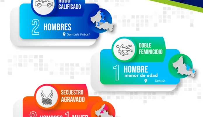 Por secuestro agravado, se capturó a María de Lourdes “N”, Christian “N” y Oscar Fernando N”, en la ciudad Capital; por el delito de feminicidio en Tamuín se detuvo a un menor de 16 años de edad.