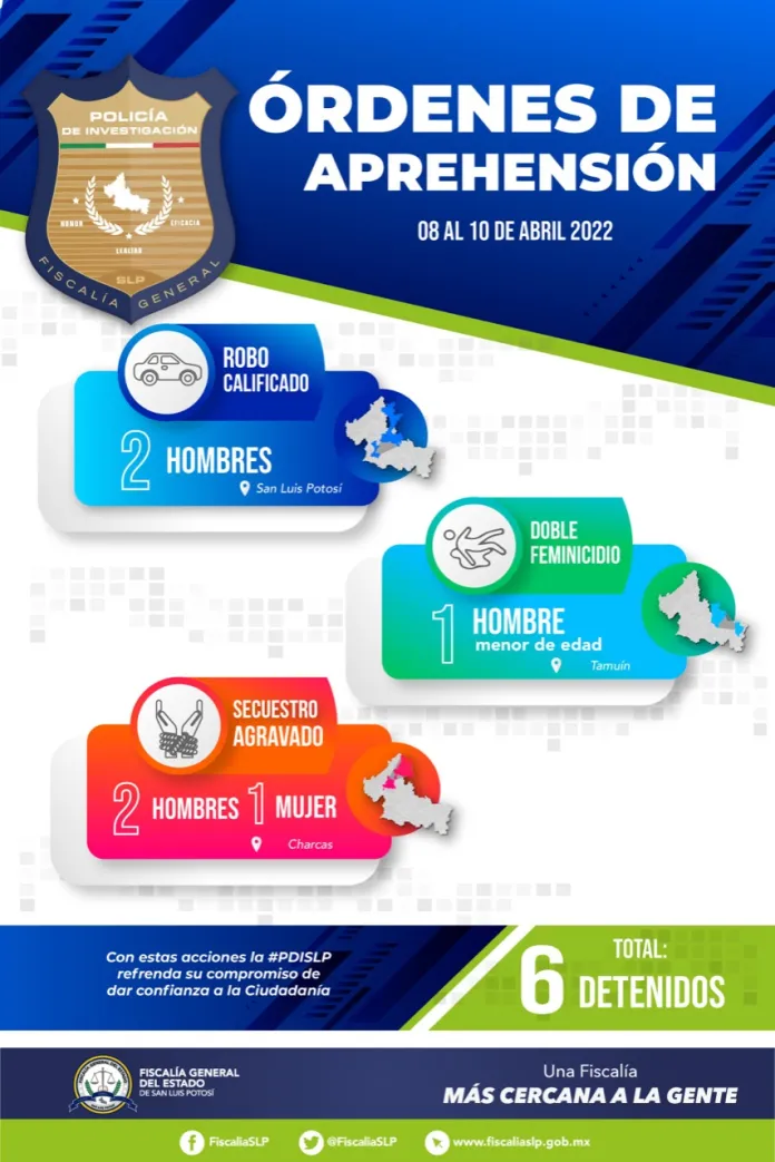 Durante este fin de semana, la Fiscalía General del Estado (FGE) llevó a cabo la cumplimentación de seis órdenes de aprehensión por diversos delitos cometidos en territorio potosino.