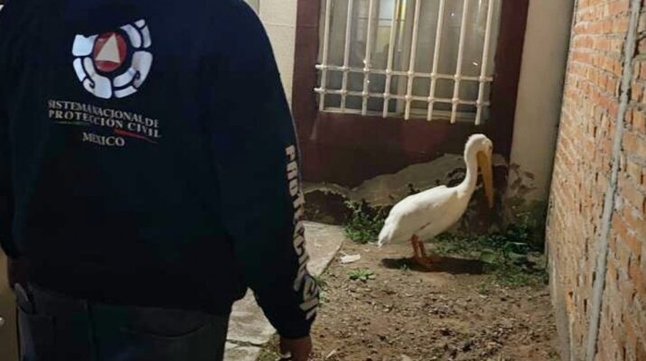 Personal de Protección Civil Municipal de Soledad de Graciano Sánchez, acudió a la calle circuito San Juan en la colonia Santa Lucía, donde se reportó el aterrizaje de un pelícano en la cochera de un domicilio particular.