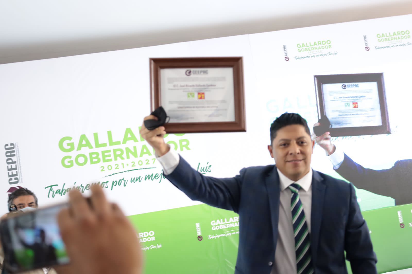 José Ricardo Gallardo Cardona recibió del Consejo Estatal Electoral y de Participación Ciudadana (CEEPAC) su constancia de mayoría que lo acredita como gobernador electo de San Luis Potosí para el periodo 2021-2027, con un total de 458 mil 82 votos y una amplia diferencia de 58 mil 120 votos sobre su más cercano competidor.