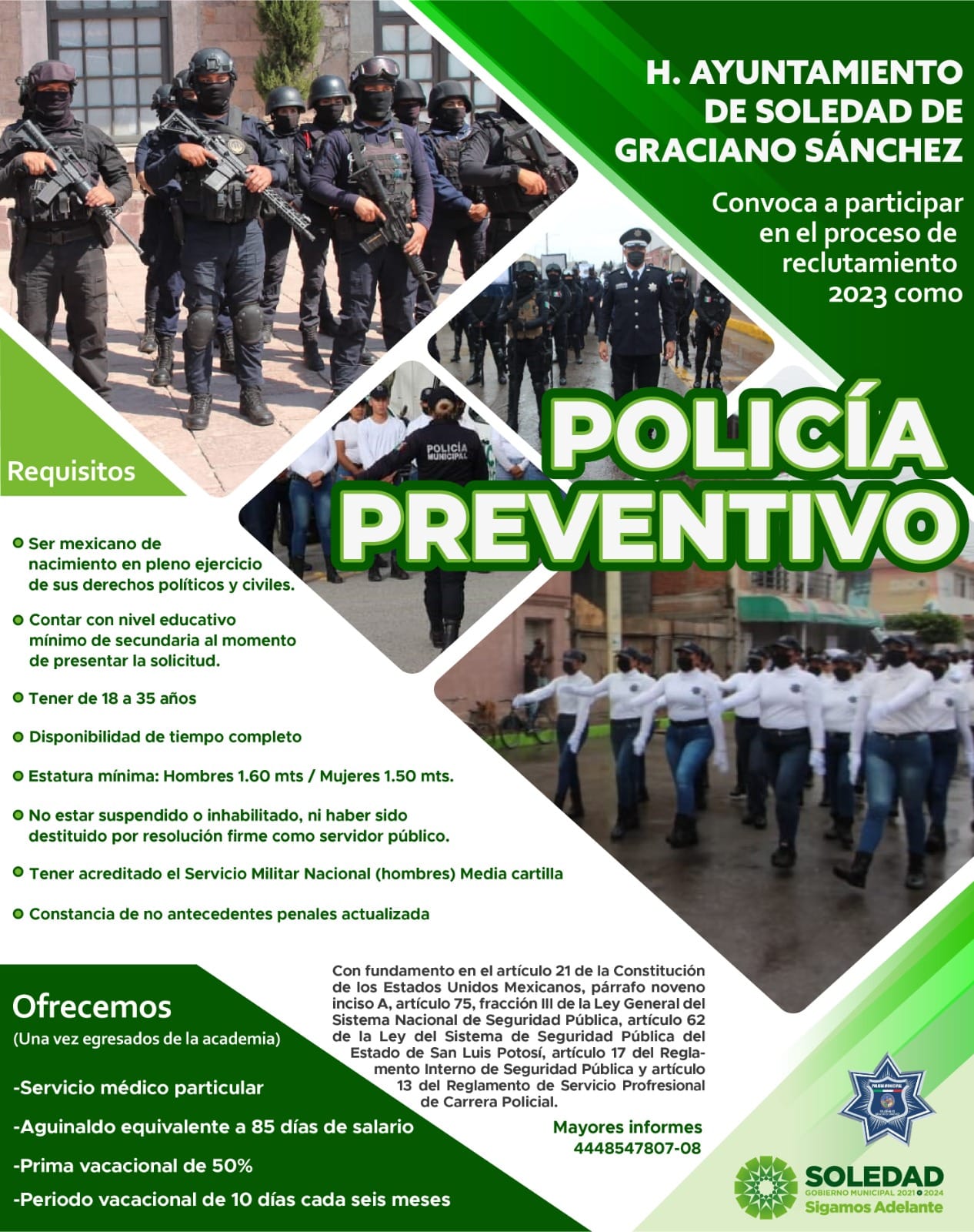 Seguridad Pública de Soledad de Graciano Sánchez mantiene abierta la convocatoria para que ciudadanos de cualquier municipio se acerquen para sumarse a las filas de la corporación, por lo que una vez más invita a todas las y los interesados a ser parte de una mejorada policía municipal, cuyo objetivo es servir con honor, lealtad y honradez.