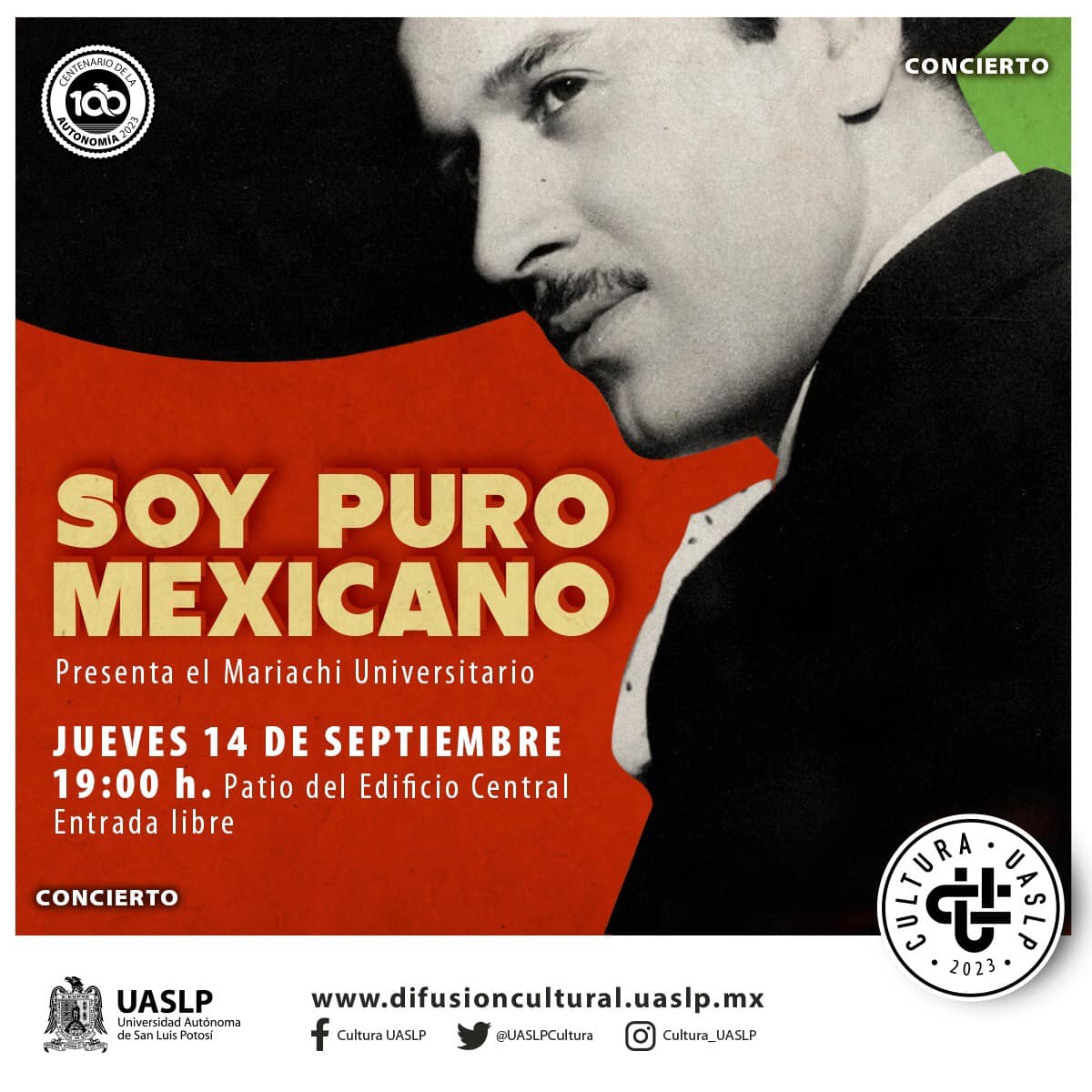Con motivo de las fiestas patrias, la Universidad Autónoma de San Luis Potosí a través de la Secretaría de Cultura, invita a la comunidad universitaria y público en general, al concierto “Soy Puro Mexicano”, el cual estará a cargo del Mariachi Universitario. La cita es el próximo jueves 14 de septiembre de 2023, en el Patio del Edificio Central Universitario, en punto de las 19:00 horas, la entrada es completamente libre.